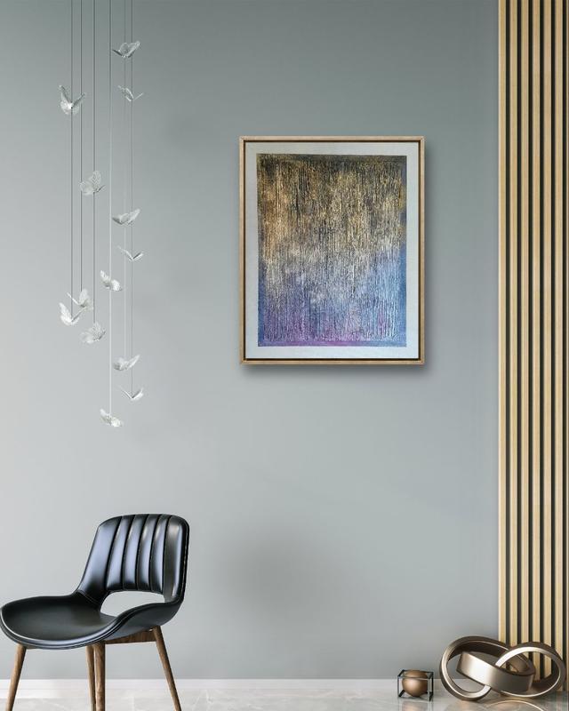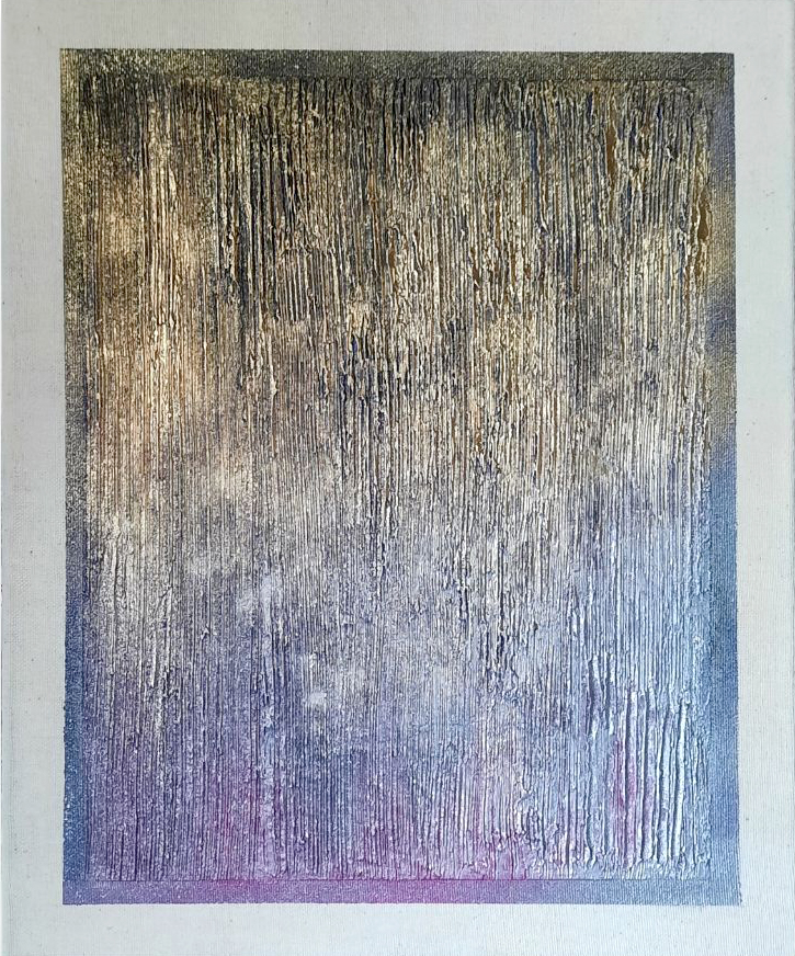 Купить интерьерную картину абстракцию, чтобы добавить в свой дом элемент утонченной элегантности? Эта текстурная абстрактная картина представляет собой завораживающее сочетание богатой фактуры и нежных цветовых переходов. Вертикальные мазки, выполненные с применением различных техник, создают ощущение струящейся поверхности, напоминающей то ли мерцающий дождь, то ли переливы света на водной глади. Цветовая палитра плавно меняется от теплых золотистых и бронзовых оттенков в верхней части картины к холодным серебристым и приглушенным фиолетовым в нижней, создавая эффект деграде и ощущение глубины. Эта современная работа выполнена в стиле последних трендов минимализма, где акцент делается на выразительности материала и формы.